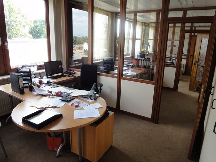 Der hintere Hallenbereich wurde im Jahre 1967/68 errichtet. Der zur Straßenseite liegende neuere Büroteil, mit anschließender Halle wurde an das vorhandene hintere Hallenteil, im Jahre 1988 angebaut. Innen- und Aussenwände sind als Mauerwerk errichtet worden. Die Bedachung ist als Satteldach ausgeführt. Gr0ßzügig dimensionierte Fenster, lassen viel Licht in die einzelnen Räume. Die Bürotüren sind in Naturholz mit Glasausschnitt verarbeitet. Der Bodenbelag ist aus Estrich, darüber wurde in den Büros Teppichboden verlegt. Die Heizung ist als Ölzentralheizung vorgesehen. Die Liegenschaft besteht aus einem repräsentativen Büroteil und anschließenden Produktions- und/oder Lagerhallen. Auf der Freifläche sind 14 PKW- Einstellplätze vorhanden.