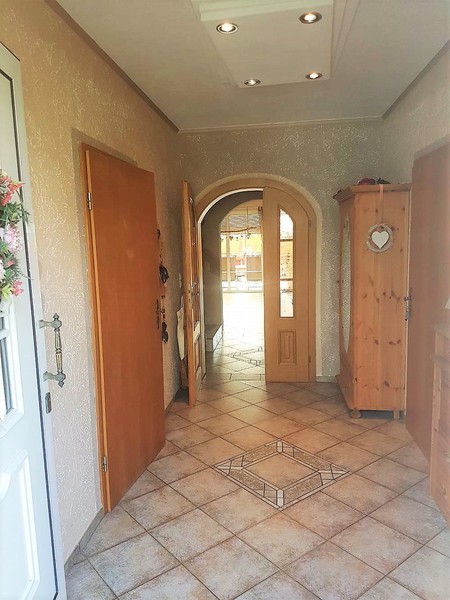 Durch die moderne Eingangstür erreichen Sie den geräumigen Flur des Erdgeschosses, der Zugang zu Wohn- und Essbereich, Küche, Kinder/Gästezimmer, Gäste-WC, Hauswirtschaftsraum, sowie der Treppe ins Obergeschoss ermöglicht.