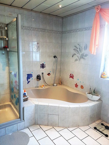 in dem sich 4 Schlafzimmer und ein großes Badezimmer mit Dusche und Eckbadewanne befinden. Über eine Raumspartreppe erreicht man den ausgebauten, ca. 25 m2 Dachboden, der derzeit als Hobbyraum genutzt wird.