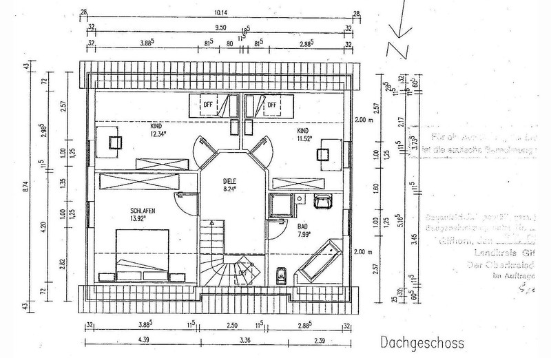 Im 1.Obergeschoss (ca.54 m2) befinden sich weitere drei Zimmer, ein Schlafzimmer, zwei Kinderzimmer und ein komfortables Badezimmer mit Tageslicht.