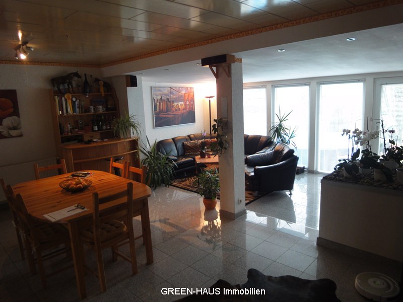 Im Erdgeschoss, bildet der große Wohn- Essbereich mit der offen gestalteten Küche und einem Zugang zur Terrasse und Garten in Süd-Westausrichtung, den Mittelpunkt dieser Immobilie. Große, bodentiefe Fenster und hochwertige Granitfliesen Boden verleihen diesem offenen und sonnendurchfluteten Wohnbereich zu jeder Jahreszeit eine besondere Wohnatmosphäre.