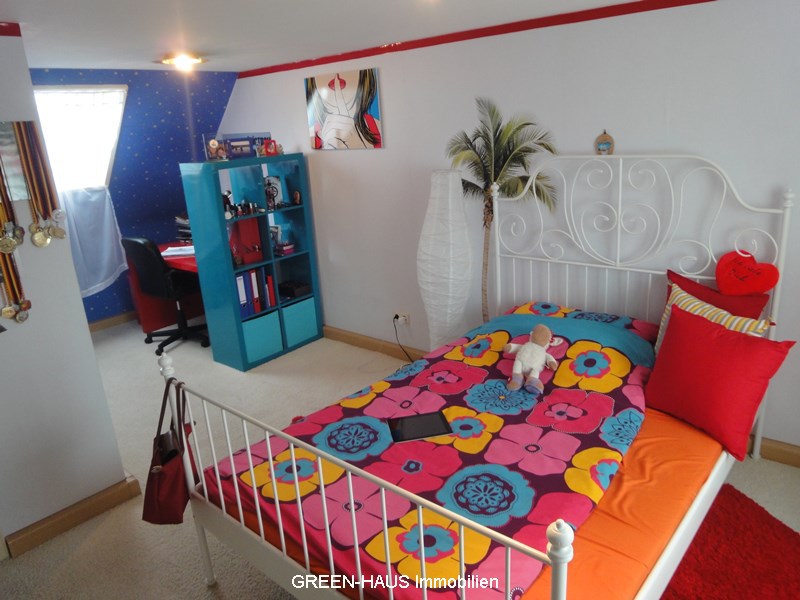 Im 1.Obergeschoss befinden sich das Schlafzimmer mit einem kleinen Balkon, ein Kinderzimmer und ein sehr modern, groß und hell gestaltetes Badezimmer inklusive Badewanne und Dusche mit Tageslicht. Im 2.Obereschoss befinden sich weitere 2 Zimmer die ideal als Kinderzimmer oder Gäste-, Jugend- oder Arbeitsbereich ihre Verwendung finden können.