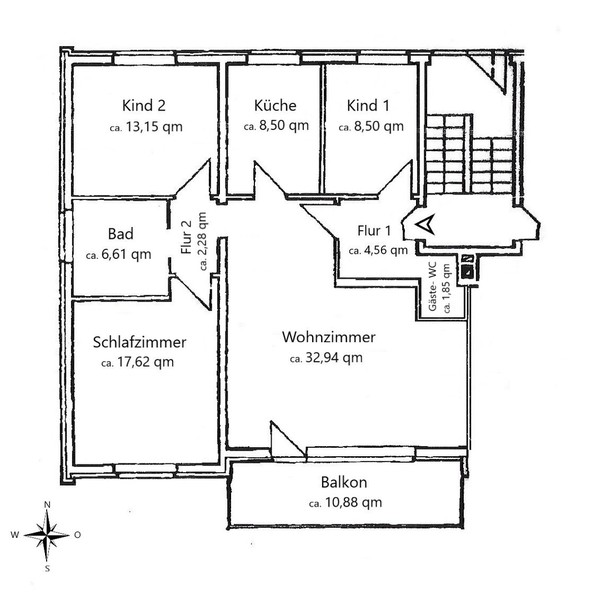 Insgesamt stehen auf ca. 98 m² Wohnfläche – 4 Zimmer, Diele, Küche, 1 Balkon, Tageslicht- Wannenbad mit Dusche sowie ein Gäste-WC zur Verfügung.