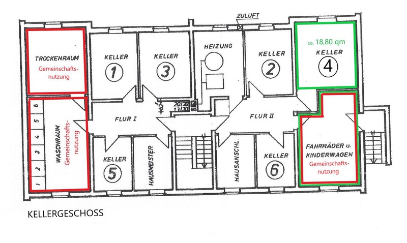Zur Wohnung gehört zusätzlich ein geräumiger Kellerraum mit Außenfenstern, ein Gemeinschaftsgarten, der gemeinschaftliche Waschraum mit Waschmaschine und Trockner, ein weiterer Trockenraum sowie ein Fahrradkeller. Ihren PKW können sie in einer großzügigen eigenen Garage inklusive elektrischem Tor direkt auf dem Grundstück unterbringen.